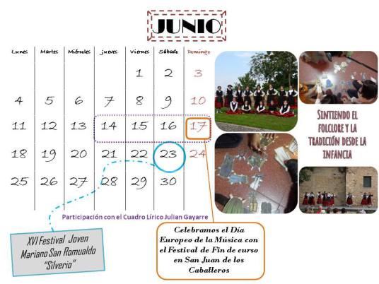 Os dejamos lo que tenemos preparado para este mes de junio, en el que celebraremos el Día Europeo de la música con el Fin de Curso, daremos protagonismo a los niños y niñas con el Festival Jóven Mariano San Romualdo "Silverio" y participaremos, un año más, con el Cuadro Lírico Julián Gayarre en la representación de la Zarzuela "El Soto del Parral".