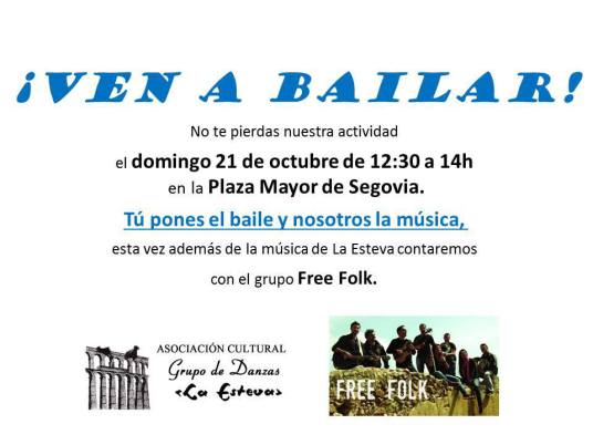 Este domingo, 29 de abril, celebramos el Día de la Danza con un "Ven a bailar", que haremos en la Plaza Mayor de Segovia, de 12:30 a 14:00 horas. En esta ocasión, contaremos con la compañía de Free Folk. Con este fragmento del manifiesto por el Día Internacional de la Danza, os invitamos a acompañarnos: