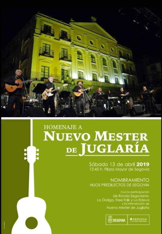 Este sabado, la ciudad de Segovia homenajeará a nuestros amigos del Nuevo Mester de Juglaría, tras nombrarles Hijos Predilectos e Hija Adoptiva a Llanos. Por ello, y por ellos, estaremos en la Plaza Mayor, acompañándoles junto con otros grupos del folclore segoviano este sábado 13 de abril, a las 12:45 horas.